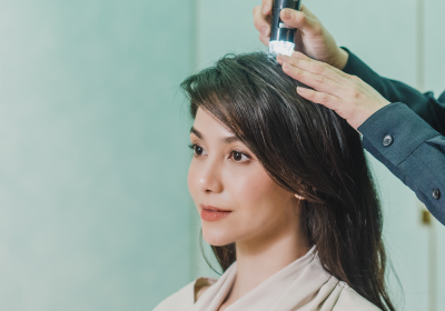 毛髪診断士が、髪の量や頭皮の状態をマイクロスコープを用いて確認し、薄毛、脱毛、白髪などのお悩みの原因を探る。