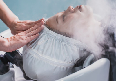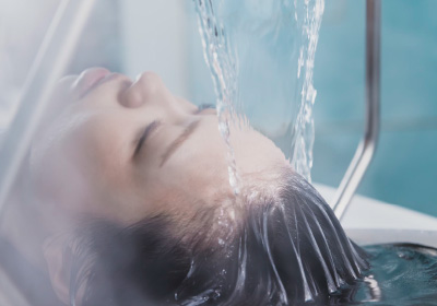 炭酸泉のお湯をかけ流しながら、 溜めたお湯に頭全体を浸すことで至福のリラックスタイムへ。 頭皮と髪に付着した汚れを優しく洗浄する。